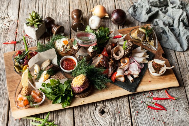 Щедрое полено: ассорти сала, мясной базар, икра из крапивы, форшмак, оливье, сельдь с печеным картофелем, белые грибы, соления, семга
