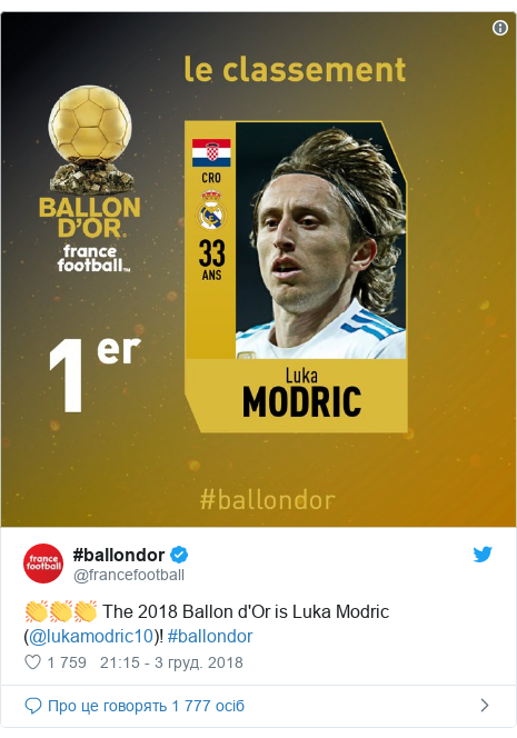 Капитан сборной Хорватии по футболу, полузащитник клуба «Реал Мадрид» Лука Модрич получил престижную награду «Золотой мяч» от издания France Football.