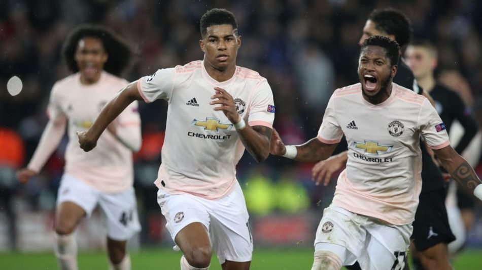Один из героев матча нападающий «Манчестер Юнайтед» Маркус Решфорд и его коллега по команде, экс-игрок донецкого «Шахтарая» Фред празднуют — только что счет стал 3:1 в их пользу