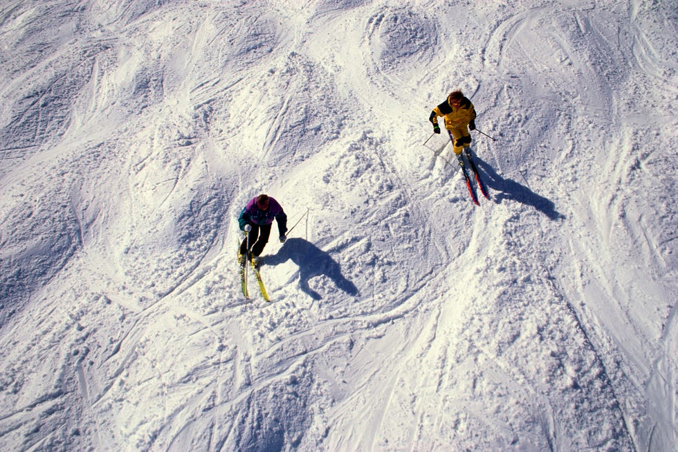 Comstock Images Двойной могул сталкивает двух лыжников друг с другом в гонке на дно.