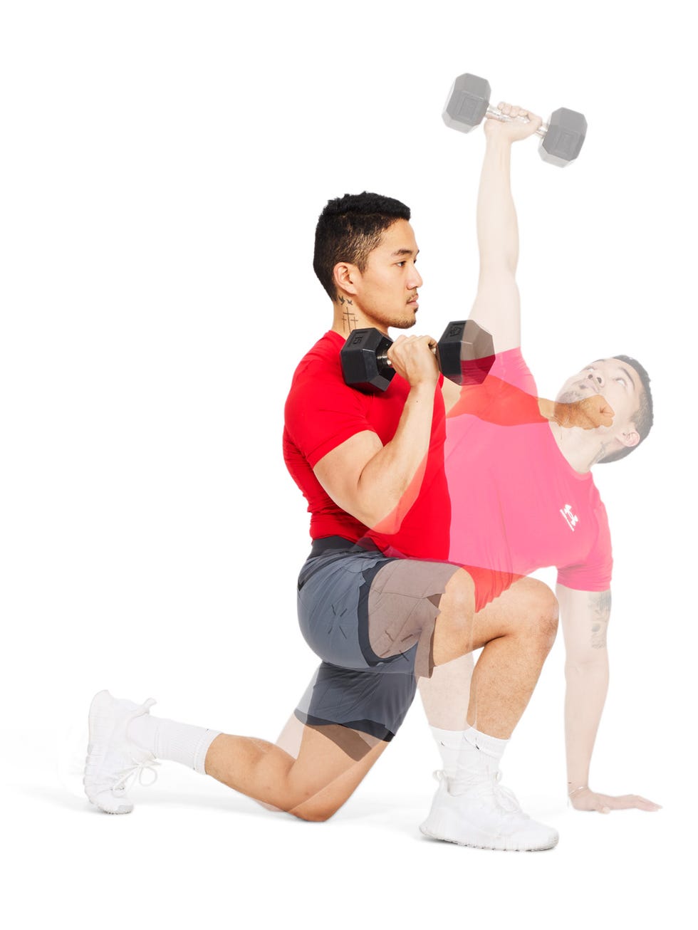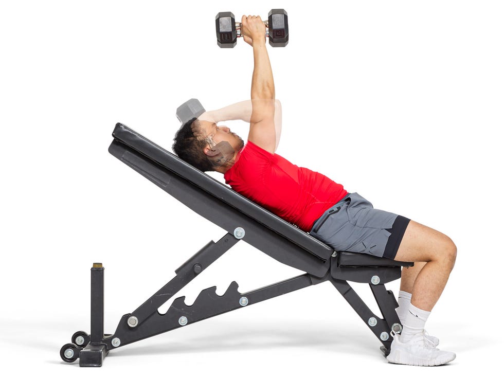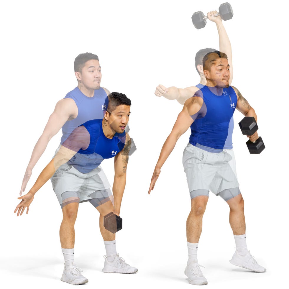 Как только гантель достигнет высоты плеч, нанесите удар над головой, чтобы увеличить силу плеч и укрепить длину позвоночника. Опуститесь к плечу, и вы готовы к следующему повторению.